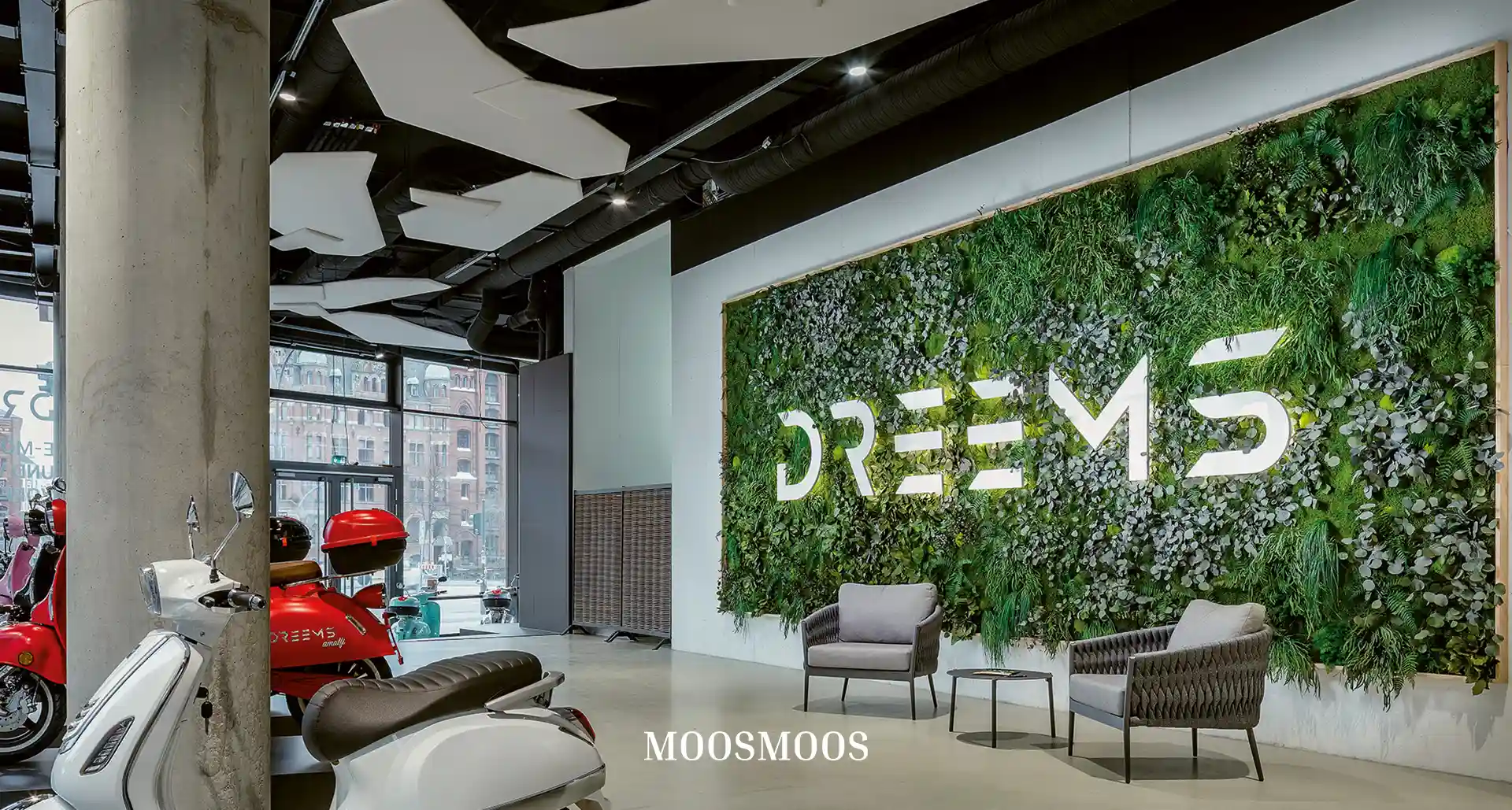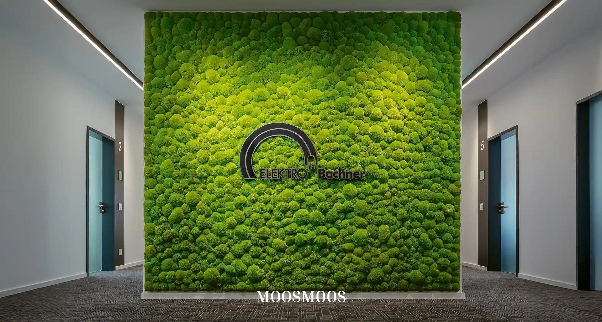 Unsere Mooswand mit Logo bietet ein einzigartiges Logodesign, das perfekt auf Ihre Wünsche abgestimmt ist. Mit einer breiten Palette strahlender Farben lässt sich Ihr Corporate Design in Moos umsetzen. Ob auf Messen, im Wartebereich Ihrer Praxis oder als Markenlogo in Filialen – eine Mooswand mit Logo eröffnet unzählige Gestaltungsmöglichkeiten mit natürlichen Rohstoffen. MOOSMOOS bietet von verschiedenen Moossorten über stabilisierte Pflanzen bis hin zu Holzarten alles, was Sie für eine unverwechselbare Präsentation benötigen. Zudem verbessert unsere Mooswand die Raumakustik mit einer zertifizierten Schalldämmung von bis zu 60%. Vor Produktionsbeginn bieten wir eine Visualisierung, um Farbe, Form und Größe präzise festzulegen. Lassen Sie sich beraten und erleben Sie, wie eine Mooswand mit Logo Ihre Marke auf ein neues Level hebt!
