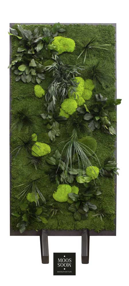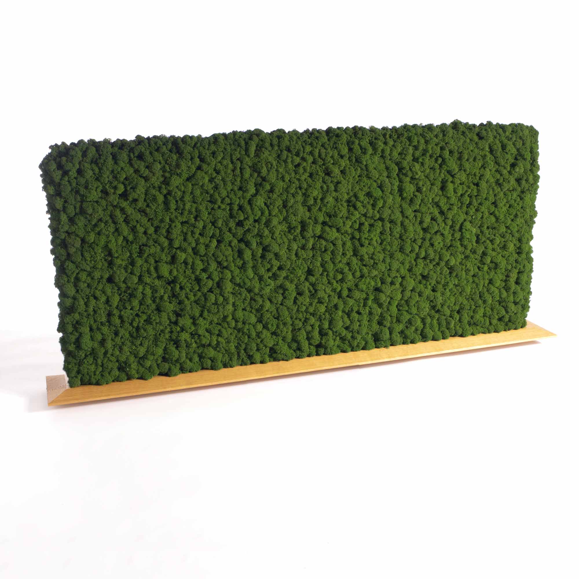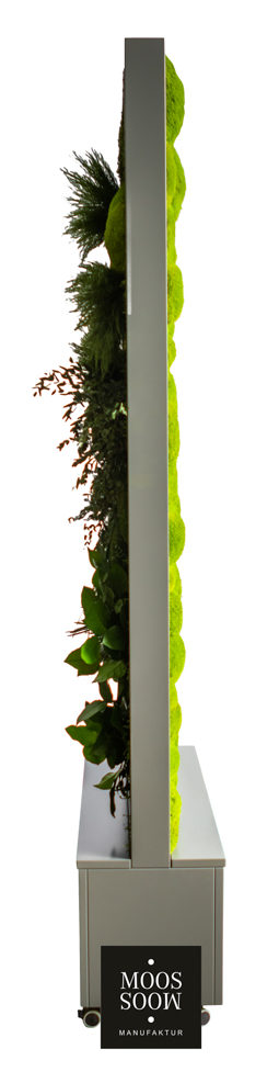 Unsere Raumtrennwand überzeugt durch erstklassige Qualität der verwendeten Materialien und Moose. Die Trennwand besitzt abnehmbare Füße. Somit ist sie leicht transportabel und platzsparend verstaubar. Perfekt für Messen und Büros. Durch die hohe 60% schallabsorbierende Wirkung können Räume geschaffen werden, welche akustisch voneinander abgetrennt sind. Wie all unsere anderen Moosprodukte, reguliert die Trennwand außerdem die Luftfeuchtigkeit. Diese Raumtrennwand kann sowohl einseitig auch als beidseitig bemoost werden und wird somit zu einem echten Unikat.